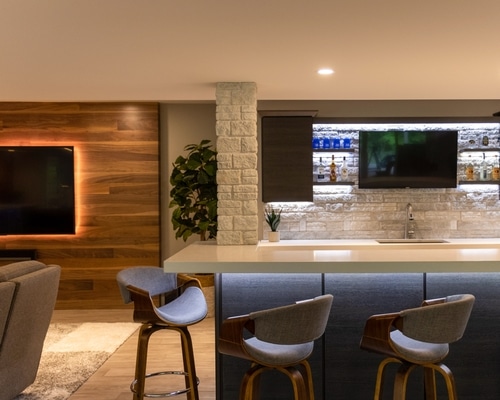 One such friend of Aptitude, Nick Mantia, actually went to high school with Aptitude owner Matt Mierek. Mantia recently came to Aptitude to request work on a renovation project for his previously unfinished basement. The result, as you can tell by the photos, is pretty stunning. Mantia, Mierek and Aptitude designer Jenna Siebert worked together to come up with the modern, elegant aesthetic, achieved with a sleek bar top, pale-colored stone and two tones of wood for the floor and walls.