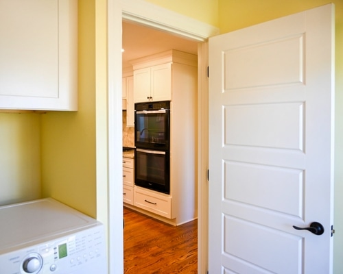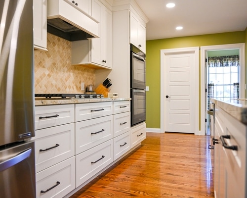 To complete the remodel, Mierek and his team went to great lengths to ensure the new space would blend seamlessly with the old. Whereas the previous kitchen had included a tile floor, the new arrangement allowed for wood flooring to continue from the rest of the home. “In this project, there was different flooring in the kitchen because it had been essentially a separate room from the rest of the home—so we installed unfinished hardwood in the new kitchen area, and sanded and refinished all the existing hardwood. This allowed us to stain and polyurethane everything to match,” Mierek notes.